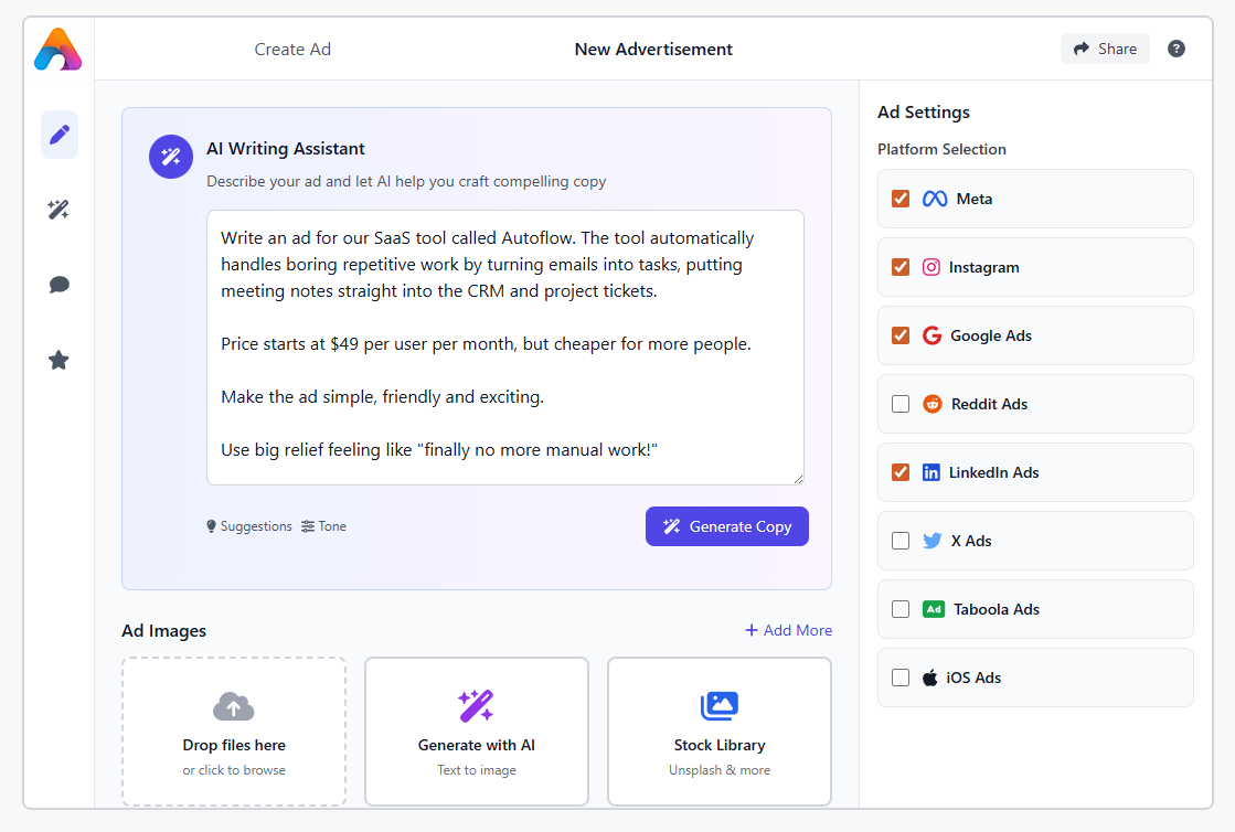 Does the platform include AI copywriting for ads?