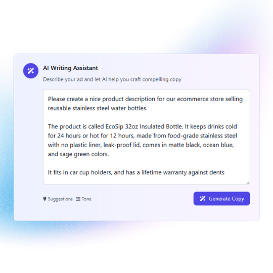 Yes. AdRushPro includes an AI writing assistant that helps generate high-converting ad copy based on your ideas or brief descriptions. It can work with complete copy, or based on direction.