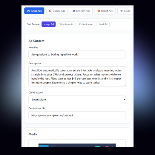 AdRushPro saves you from wasting hours copying and adjusting the same content across Facebook, Google, LinkedIn, and everywhere else your ads run.